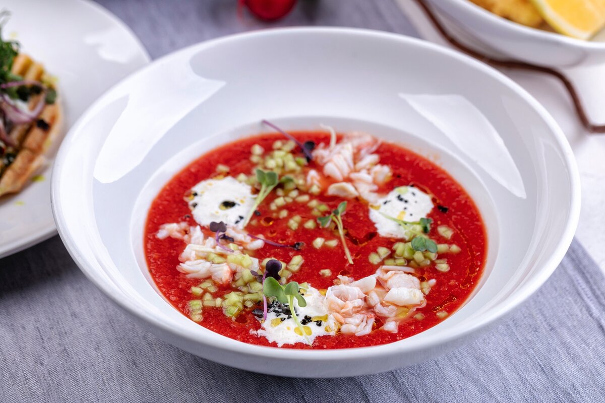В холодную тарелку налить порцию томатной основы. Сверху выложить мясо краба, страчателлу и рубленные огурцы.