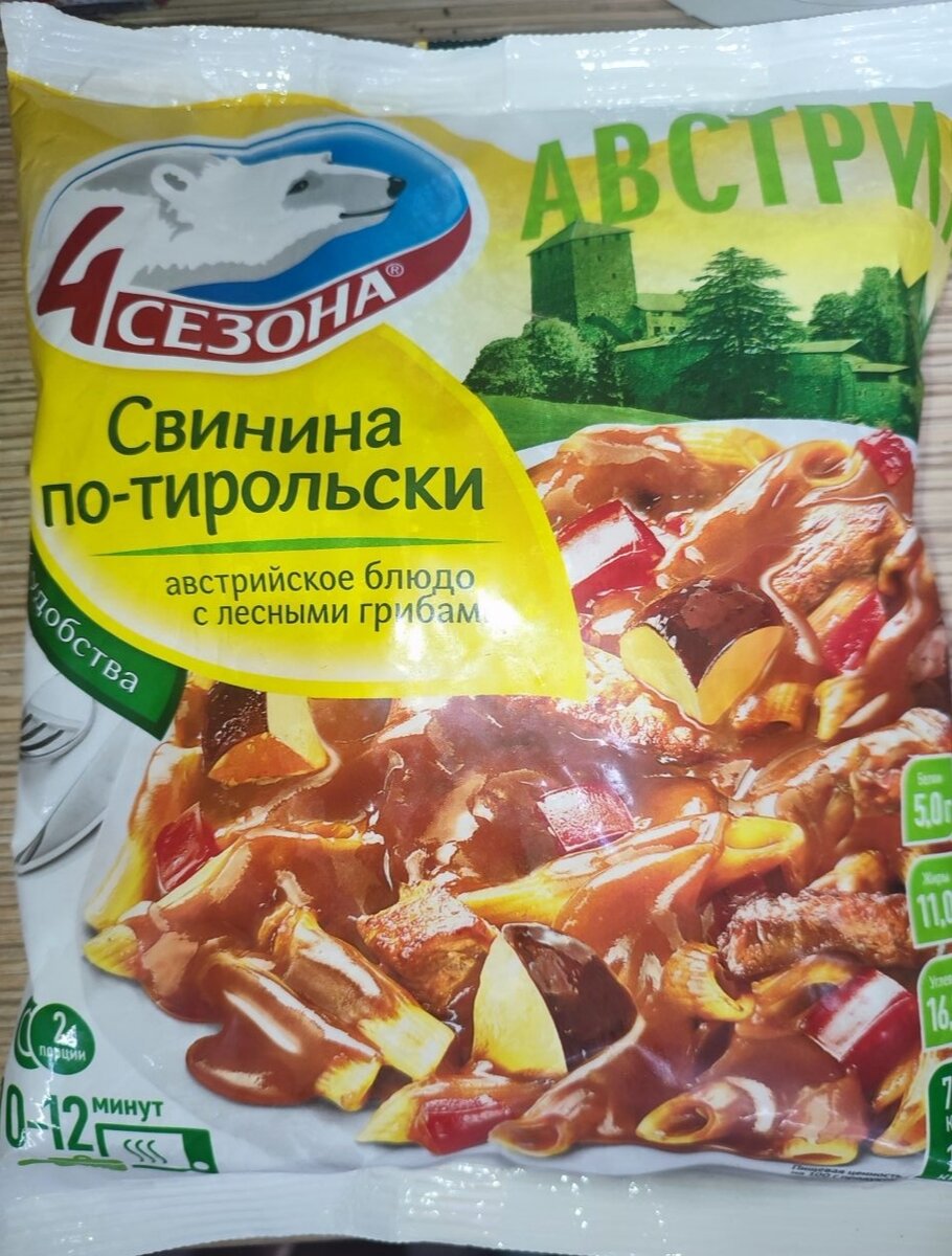 Все уже знают, что я люблю смеси от 4 СЕЗОНА. Сегодня я дегустирую австрийское блюдо с лесными грибами, оно же свинина по-тирольски. Свинина по-тирольски - это блюдо австрийской кухни, которое готовится из свинины, макарон, лука и других ингредиентов. Оно имеет хрустящую корочку и сочное мясо внутри. Состав мне показался очень интересным: макароны приготовленные (мука, вода), свинина бескостная, грибы лесные (маслята), томаты, лук, растительное масло, сухое молоко, вода, специи, соль, натуральные ароматизаторы. На обратной стороне упаковки, впрочем как и всегда, указаны 2 способа приготовления: СВЧ-печь и сковорода. Для меня предпочтителен способ на сковороде, так как блюдо еще и обжаривается, а не просто разогревается. Каждая смесь имеет шоковую заморозку, и эта не исключение. Готовить 10-12 минут без масла на среднем огне при закрытой крышке. Во время приготовления смеси чувствовался запах специй и мяса, а также грибов. Упаковки хватает на две порции, которыми можно вполне наесться