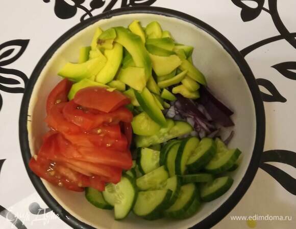 сахар - 0,5ч. л. Шаг: 1 Нарезаем авокадо тонкими ломтиками и сбрызгиваем его лимонным соком, чтобы не потемнел. Лук и огурец режем тонкими полукольцами. Помидоры тоже нарезаем тонкими полукольцами. Базилик мелко рвем руками. Сначала присыпаем сахаром помидоры, затем добавляем остальные овощи. Чуть–чуть солим и перчим. Шаг: 2 Готовим заправку. Соединяем оливковое масло, уксус, орегано, соль, перец и сахар. Размешиваем все до растворения саха