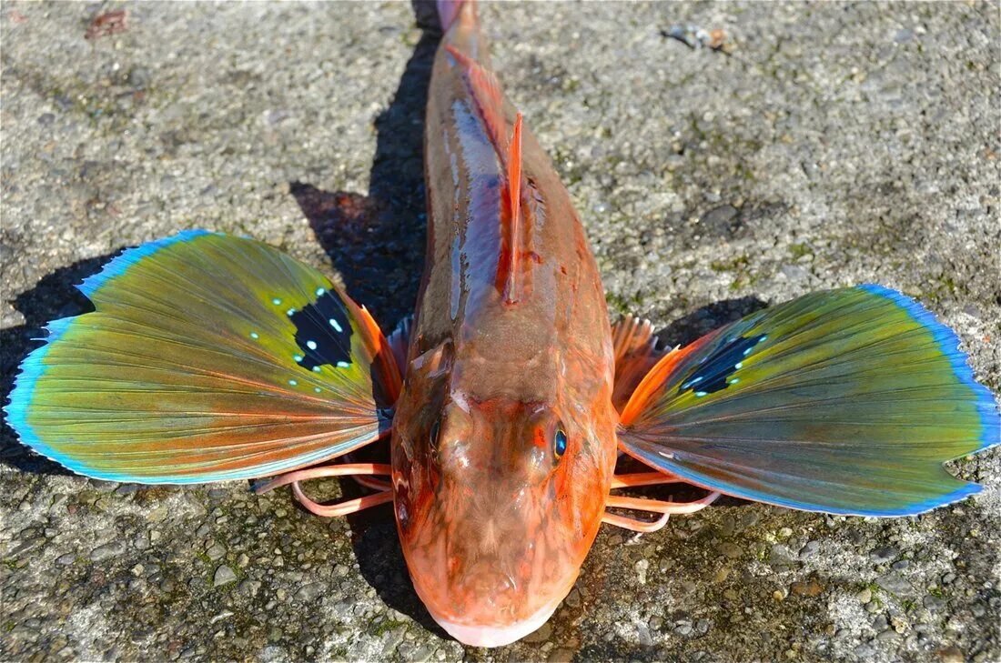 Вот, кстати, один из таких морских петушков — тригла (Chelidonichtys lucerna, сем. Triglidae), рыба с весьма необычной внешностью. За характерную форму спинного плавника, напоминающую петушиный хохолок, наличие "птичьих лапок" и окраску грудных плавников ее прозвали рыба-петух или рыба-бабочка. Хотя лично мне она больше напоминает маленького мультяшного дракончика. Да-да, все верно — у триглы есть ножки. Вернее три свободны