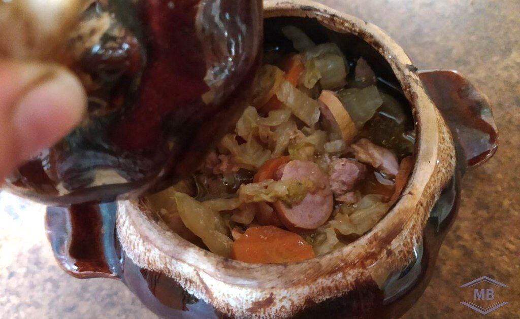 Когда куча дел, а обеда или ужин нет, выручает этот рецепт! Еда в горшочках - вкусная, полезная и без лишних усилий! Ингредиенты (2-3 порции): 250 мл воды, 250 грамм куриного филе, 4-5 шт охотничьих колбасок, 1 кочан небольшой капусты, 1 головка лука, 1 морковка, 2 столовые ложки растительного масла, 2 столовые ложки томатной пасты, 2 столовые ложки майонеза, соль и специи - по вкусу. Процесс приготовления: Куриное мясо нарезаем порционными кусочками, колбаски - небольшими колечками, морковь - кольцами, капусту - соломкой, а лук - шинкуем. Капуста для блюда подойдёт как белокочанная, так и пекинская. Соединяем нарезку в миске. Добавляем соль и специи, томатную пасту с майонезом и перемешиваем. Расширить вкусовой спектр блюда помогут грибы (шампиньоны или вешенки). Обжариваем грибы на растительном масле и соединяем с мясной и овощной нарезкой. На дно горшочков наливаем растительное масло и заполняем овощами с мясом и колбасками. Наливаем воду в горшочки до середины тары. Закрываем крыш
