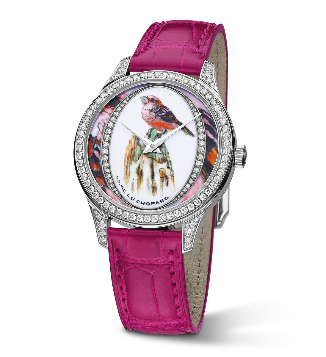 Сhopard представили часы с изображением редкой птицы семейства вьюрковых – сибирская чечевица украшает циферблат элегантной розовой модели коллекции Alpine Eagle. Часы Chopard L.U.C XP BirdLife с 35-миллиметровым корпусом выполнены из белого золота и дополнены кожаным ремешком цвета фуксия, напоминающего оперение редкого вида птиц. Сердцем изделия является механизм L.U.C 96.17-L с автоподзаводом и запасом хода 65 часов. Деньги, вырученные с продажи оригинальных ярких часов, пойдут в BirdLife International, а сбор будет приурочен к 15-летию вступления принцессы Хисако Такамадо в должность почетного президента организации, нацеленной на защиту птиц и основанной в 1922 году.