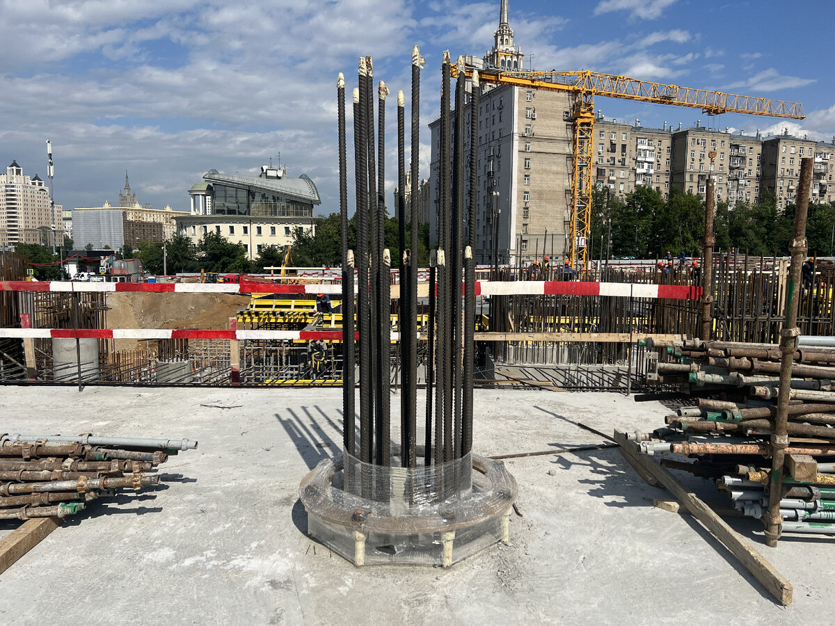 На территории жилого комплекса «Бадаевский» начались работы по устройству конструкций, которые будут служить опорным блоком 35-метровым колоннам.
