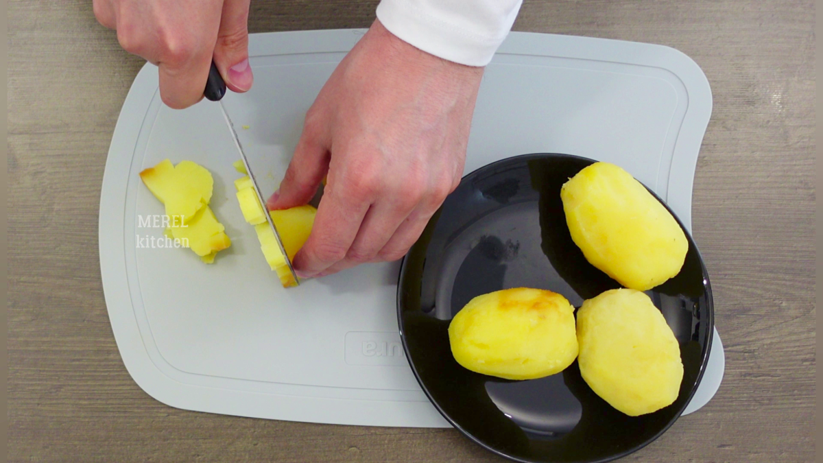 Действительно необычно, но очень вкусно! Я даже не думал, что меня можно удивить! Обычный оливье ел, а вот когда в гостях подали на стол оливье "по-испански", сначала отнесся с подозрением, но когда попробовал, понял, что теперь тоже буду такой готовить! Салат получается очень вкусным, сочным, сочетание ингредиентов на мой взгляд просто идеальное! Для приготовления салата оливье по-испански нам понадобится картофель 4 штуки. По классике конечно овощи на салат отвариваются, но я решил сделать с запеченными и не прогадал, получилось просто божественно! А вообще запеченные овощи в салат это всегда вкуснее! Запеченный картофель нужно порезать мелким кубиком и переложить в глубокую миску или салатник. Все ингредиенты нужно нарезать примерно одинаковым кубиком, чтобы никакой овощ не доминировал по вкусу в салате! Дальше беру вареное яйцо четыре штуки и так же нарезаю его мелким кубиком. Перекладываю нарезанные яйца в салатник к картофелю. Потом беру одну крупную морковь и тоже наре