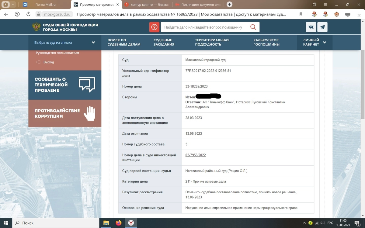 ⚖️ Сегодня (по видеоконцеренц связи из Фрунзенского районного суда) я приняла участие в судебном заседании, прошедшем в Московском городском суде. В данном случае я представляла интересы истца в гражданском деле. Мы оспаривали исполнительную надпись нотариуса. Это было очень сложное и затянутое дело. Его оспаривание заняло 1 год и 5 месяцев и завершилось только в апелляционной инстанции. Суть возникновения спора заключалась в том, что мой доверитель оформил карту у банка Ответчика (см.фото), но воспользоваться ей в своих целях в полном объеме не успел. Денежные средства были похищены неизвестными. Незамедлительно по моей рекомендации, доверитель обратился в полицию, в результате чего было возбуждено уголовное дело. Банку ответчику мой доверитель также сообщил о происходящем в день хищения, сохранив всю переписку с его представителями. Это был декабрь 2020 года. В августе 2021 года, банк обратился к мировому судье, по месту жительства моего доверителя с заявлением о вынесении суд