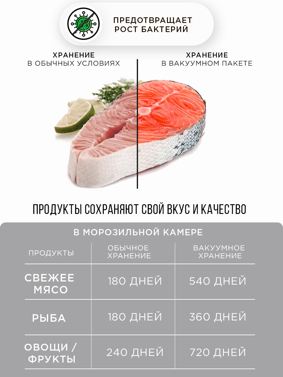 Вакуумные пакеты для еды стали незаменимыми помощниками на кухне. Они увеличивают срок хранения продуктов в 6 раз и сохраняют их свежесть и вкус! Какие бывают вакуумные пакеты: 1. Вакуумные пакеты разных размеров с ЗИП-замком, из которых нужно самостоятельно убирать воздух. 2. Вакуумные пакеты для вакууматоров: в рулонах (такой вариант позволяет нарезать необходимый размер пакета) или готовые нарезанные пакеты разных размеров. С помощью вакууматора можно: - обеспечить полное отсутствие воздуха в пакете, что позволит сохранить продукт в полной сохранности и уменьшить его объем до 45%. - сэкономить время, предоставив возможность ваккуматору автоматически все сделать за вас за пару минут. Итак, причины, по которым нужно приобрести вакуумные пакеты прямо сейчас: