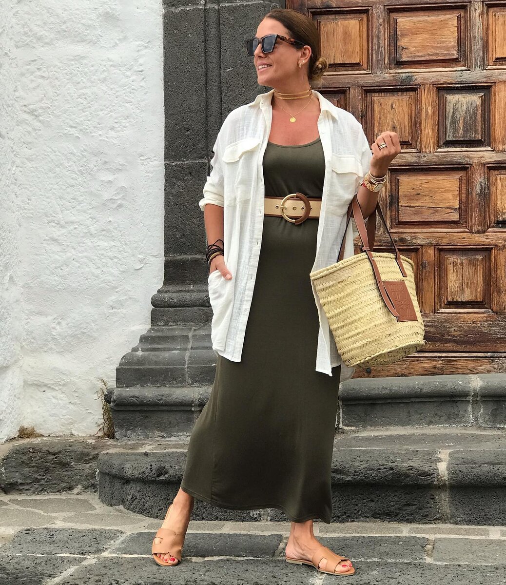 Испанки в одежде высоко ценят комфорт и практичность, но при этом не забывают об элегантности. Наша сегодняшняя героиня уже перешагнула 45-летний рубеж. Давайте рассмотрим простые и стильные сочетания на теплый сезон от испанской модницы. Платье + рубашка свободного кроя – практичный дуэт на лето. Макси хорошо ладит как с обувью на каблуке, так и с обычными шлепанцами. Блогер выгодно подчеркнула талию поясом и добавила наряду практичности с помощью соломенной сумки, солнцезащитных очков. С наступлением тепла, строгий брючный костюм можно заменить на костюм с шортами. Вариант без лишних деталей отлично смотрится в обществе полосатого кроп-топа, босоножек с тонкими ремешками, бежевой сумки-тоут. Не хуже на женщине смотрится костюм-двойка с перфорацией. Модель жизнерадостного желтого оттенка – идеальное решение на текущий сезон! Небесно-голубой комбинезон красиво оттеняет и подчеркивает смуглую кожу. Контрастный пояс ничуть не вредит модному имиджу, напротив, делает акцент на талии. Блоге
