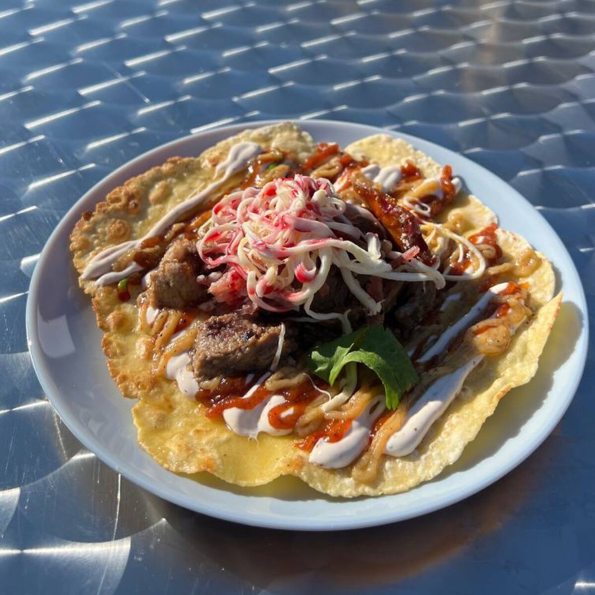 🌮Ингредиенты: Томатный джем – 20 г Крем из печеного чеснока – 20 г Пряный мацони – 20 г Томленая баранина – 30 г Сыр косичка – 10 г Колбаса Фуэт из баранины – 5 г Гранатовый соус – 5 г Вяленая хурма – 5 г Кинза – 1 лист Кукурузная лепешка (60 г) – 1 шт 🍅Томатный джем Ингредиенты: Томаты – 200 г Лук красный – 50 г Кинза – 10 г Сахар – 150 г Кавказские травы – 5 г 1. Нарежьте все ингредиенты и тушите 30 минут. 2. Смешайте получившуюся массу в блендере – готово! 🥛Пряный мацони Ингредиенты: Мацони – 200 г Сванская соль – 20 г 1. Перемешайте до растворения соли. 🧃Гранатовый соус Ингредиенты: Сок граната – 400 г Сахар – 100 г 1. Выпаривайте до текстуры сиропа. 🧄Соус из печеного чеснока Ингредиенты: Чеснок – 1,5 кг Оливковое масло – 60 г Соль – 60 г 1. Запекайте чеснок 50 минут при 180 градусах. 2. Затем добавьте оливковое масло и соль. 3. Пропустите получившуюся массу через блендер – должен получиться крем. 🫓Кукурузные лепешки Ингредиенты: Мука кукурузная – 1 кг Мука пшеничная – 600 г