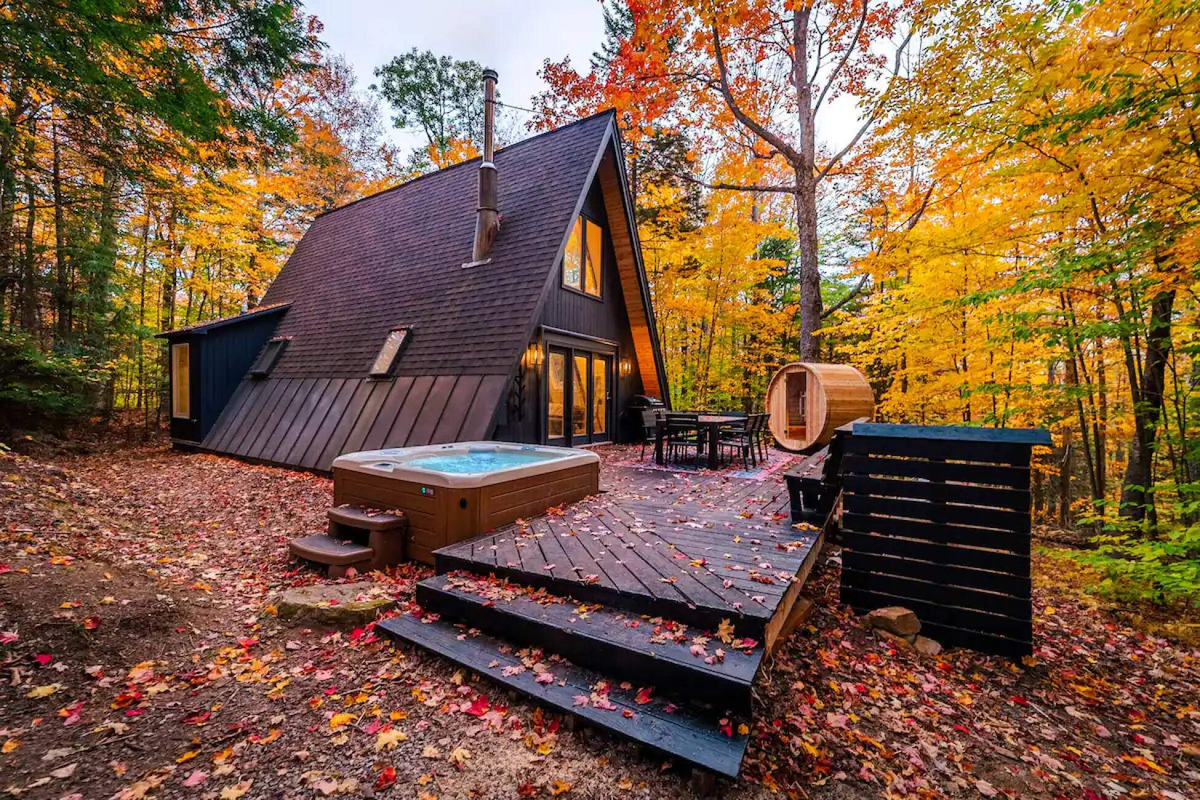 А-образные постройки, у которых два ската кровли служат еще и стенами, называют «шалашами». За счет своей формы, треугольные дома выглядят компактно, лаконично и современно Этот А-образный дом находится в горном курорте Окемо американского штата Вермонт. Он стоит на лесной поляне в окружении пышной растительности. Благодаря экстерьеру с коричневой отделкой, коттедж отлично вписывается в окружающий пейзаж. Примыкающая к нему просторная открытая терраса прямо говорит о предназначении дома. Конечно, это отдых в расслабляющей атмосфере, причем круглый год, в том числе и когда на курорт приезжают любители горнолыжного спорта. Именно они после долгих катаний по склонам способны по достоинству оценить наличие сауны-бочки и джакузи под открытым небом. На просторной террасе есть обеденная зона с газовым грилем, рядом установлены баня-бочка, рассчитанная на двоих, и гидромассажная ванна. Свободное и светлое пространство первого этажа обставлено лаконичной мебелью, напоминающей офисную. Домашний
