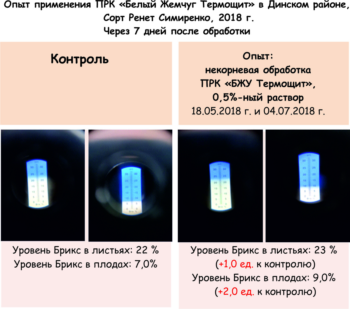 Практика применения ПРК "БЖУ Термощит" показывает отличные результаты для профилактики солнечных ожогов плодовых культур. Применение 2-кратной обработки 0,5% раствора ПРК «Белый Жемчуг Термощит» способствовало увеличению уровня Брикс в листьях и плодах растений на 1-2%, увеличению количества крупных плодов, повышению веса плодов на 14,6% и урожайности на 12,4% к контролю. Применение ПРК «Белый Жемчуг Универсальный Термощит» в Славянском районе Краснодарского края, 2021 г. Сорт Гала. Сорт Гала (плодоносящий сад) Агрофон: Сульфоаммофос 70 кг/га, КалиМаг 40 кг/га. Технология была разработана для решения следующих задач: 1. Работа с почвой: внесение в весенний период натурального органо-минерального удобрения ПРК «Черный Жемчуг Гумус», 200 кг/га. 2. Работа на увеличение урожайности и качества плодов: ПРК «БЖ Универсальный», ПРК «БЖ Дрип Са+Mg», ПРК «БЖ Термощит», ПРК «БЖ Антифриз»). 3. Снижение пестицидной нагрузки: ПРК «Белый Жемчуг ФитоЗащита». В зависимости от климатических условий г