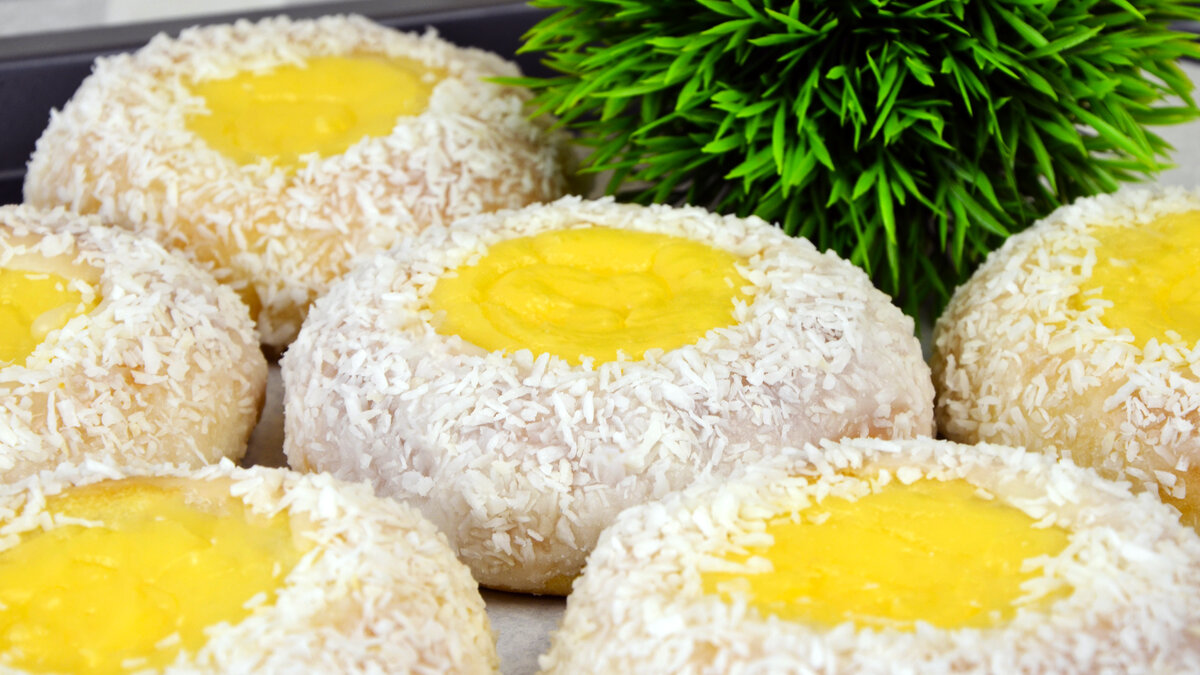 И затем посыпаем бок булочек кокосовой стружкой. И вот такая красота получается.