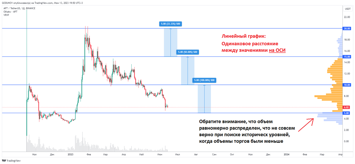 Линейный (обычный) график - это графическое представление данных, где значения на вертикальной оси цены (0, 5, 10, 15, и т.д.) находятся на одинаковом расстоянии друг от друга равном "5", но на разном процентном соотношении (100%, 50%, 33%).