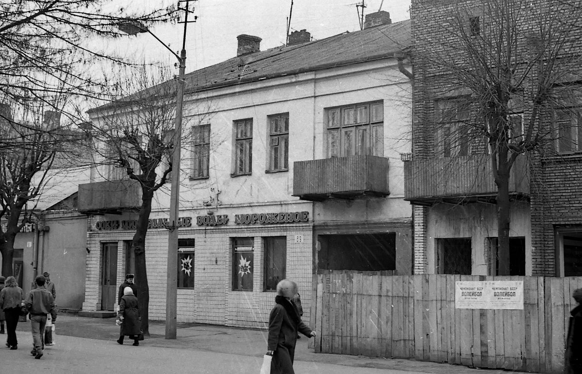 Зайти поесть в «Пельменную» или «Соки, минеральные воды, мороженное», а потом по магазинам «Грампластинки», «Сумки, чемоданы» и т. д. Смотрим, читаем, ностальгируем… В 90-х годах прошлого века я работал на полставки фотографом в реставрационных мастерских города Бреста. Недавно узнал, что мой друг Николай Власюк (старший) сохранил часть чёрно-белых плёнок того времени. Конечно, с большим интересом приступил к их сканированию. Начал с фотографий пешеходной улицы Советской 1990 года, на ней уже тогда началась реконструкция отдельных зданий. Ценно то, что на фотоснимках видно, в каких зданиях располагались магазины или точки общепита, а также чувствуется атмосфера того времени и некоторые его приметы. Прямо ностальгия какая-то… Нынешнее поколение не знает, что такое «Пельменная» времён СССР. Это было суровое заведение, где можно было недорого и быстро перекусить. В зале высокие пластиковые столики, на которые ставили посуду и стоя ели. В меню «магазинные» пельмени одного вида с мясной на