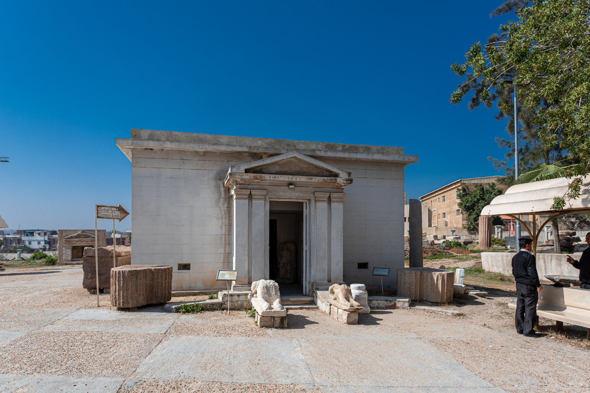 Минуя вестибюль с декорированными под раковины нишами в стенах, мы проходим в круглое помещение с куполом, поддерживаемым колоннами. Ранее там стояли статуи, одной из которых была статуя жреца греко-египетского божества Сераписа. Культ Сераписа насаждал Птолемей I, чтобы дать своему верующему в разные пантеоны богов народу общее божество. Внешне Серапис был греком, но его одежда была украшена традиционными египетскими орнаментами. Серапис имел черты египетского Аписа и греческого Аида.