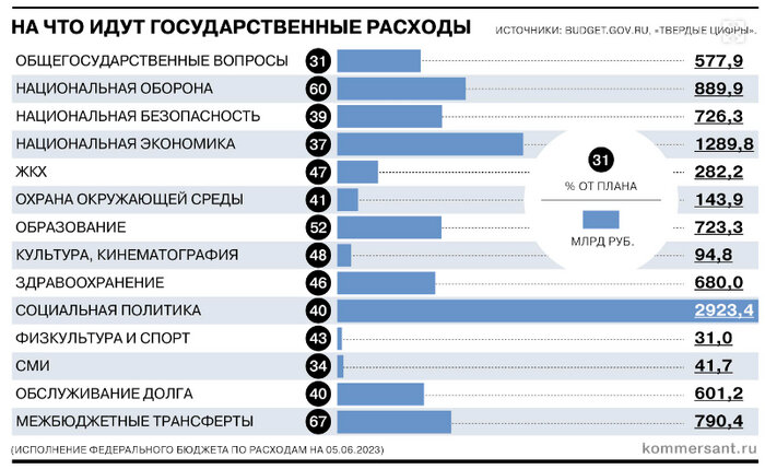 2. Минфин опубликовал предварительную оценку исполнения бюджета за январь—май 2023 года. Объем доходов составил 9,818 трлн руб., что на 19% ниже, чем за аналогичный период прошлого года. Расходы за этот период составили 13,229 трлн руб., что на 27% выше год к году. Как отмечается в комментарии ведомства, месячная динамика исполнения расходов постепенно выходит на нормальный уровень после ускоренного финансирования отдельных статей в начале года.