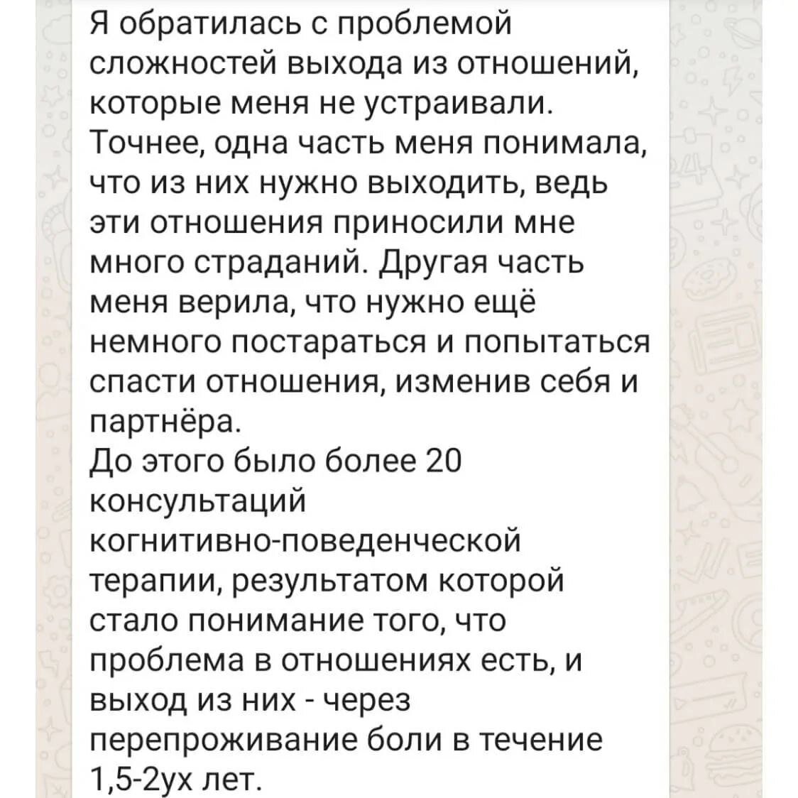 До этого было более 20 консультаций, результатом которой стало понимание того, что проблема в отношениях есть, и выход из них - через перепроживание боли в течение 1,5-2ух лет».
