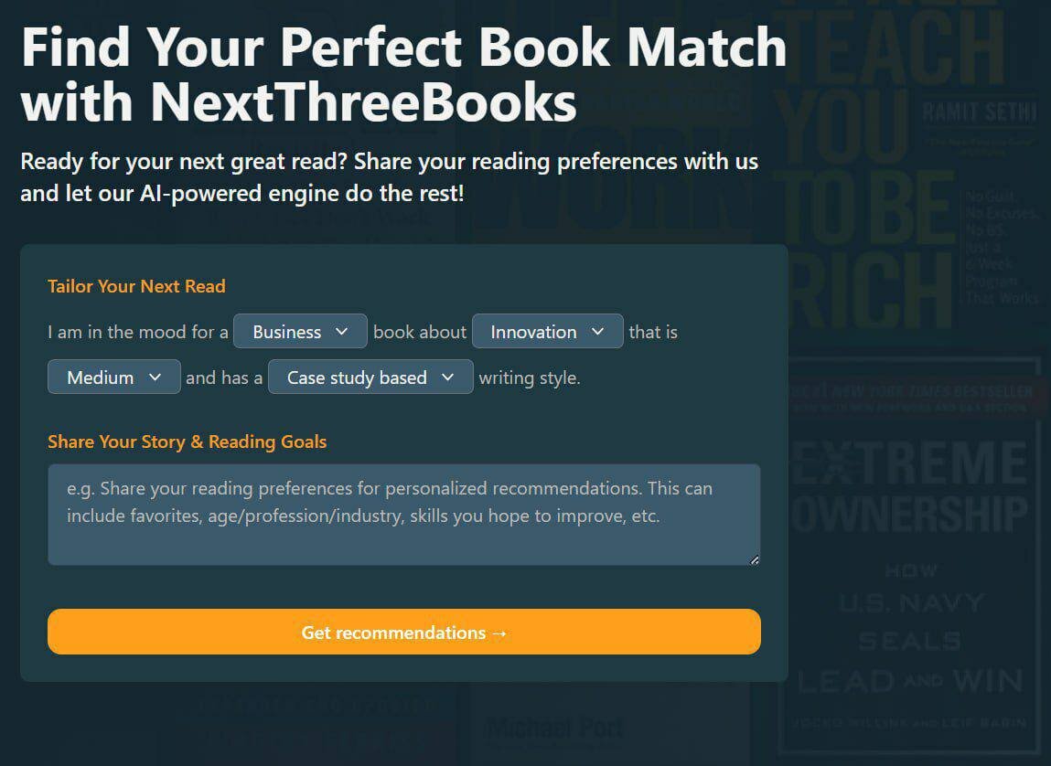 📚 NextThreeBooks - интересная нейросеть, которая может помочь с подбором книги для чтения. Сервис (https://www.nextthreebooks.com/)предлагает ряд вопросов, с помощью которых он сможет подобрать около-идеальные варианты.