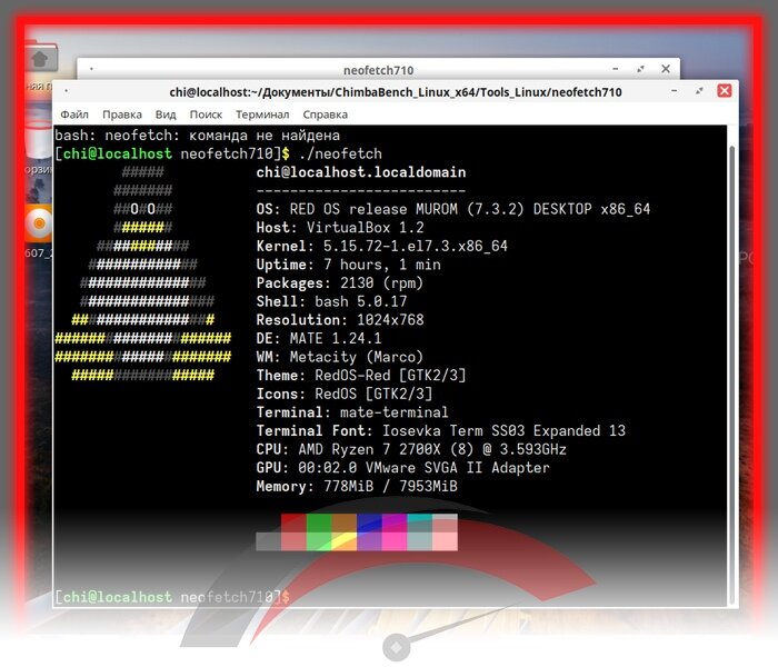 А ещё не работает neofetch как положено при вызове из бенчмарка, хотя права установились на запуск: