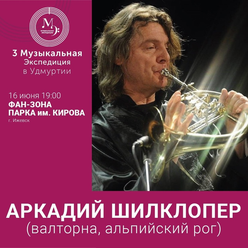 Аркадию Шилклоперу чужды повторы и массовая конвейерная серийность Стартовым днем «Музыкальной экспедиции-2023» в Удмуртии станет концерт 16 июня в Ижевске. На Фан-зоне парка имени Кирова в 19:00 желанные гости родины Чайковского и наши давние добрые друзья откроют фестиваль небесной музыкой Баха, Моцарта, Бетховена, Бруха и Соллима, которая прозвучит под открытым небом. Вместе с сочинениями великих Художников звуков в плейлисте вечера не затеряются авторские композиции Аркадия Шилклопера! Четыре года назад имя самого известного отечественного валторниста и исполнителя на альпийском роге было одним из самых магнетических в афише 62-го фестиваля искусств «На Родине П.И. Чайковского». И накануне нового визита Музыканта Шилклопера обозреватель Удмуртской филармонии с воодушевлением вспомнил лучшие сюжеты из его увлекательного монолога. – В любительский оркестр при Доме пионеров Кунцевского района Москвы меня – шестилетнего – родители отдавали под присмотр старшему брату. Он играл на барит