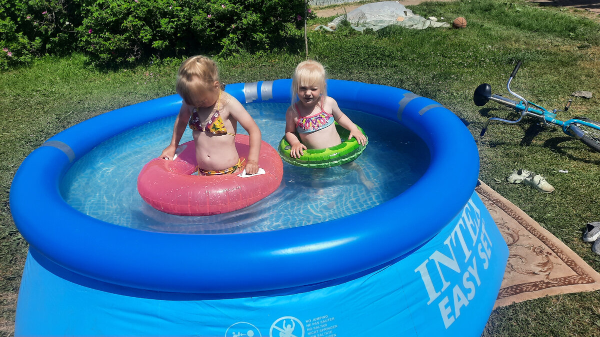 Приветствую дорогие читатели🥰 хотела бы с вами поделиться как я наверное сошла с ума😄 Проснулась утром и думаю, ведь везде каникулы а пусть девсенки остаются дома! И написала, что девочек до конца августа в саду не будет. Выходные прошли замечательно😏 ни дети, а ангелы🙏 Но не так уж и долго длилось моё счастье, в субботу мы поставили бассейн😏 и ждали пока нагреется вода, каждый день слушая нытьё о том, что вода теплая, она не холодная и мы хотим плавать😬 сегодня мои нервы сдали, я взяла шланг и в боссейн набрала воды 60° что бы была совсем теплая вода, бассейн у нас на 2 450 л, незнаю сколько я добавила туда горячей, но пришлось подспускать воду. В итоге эти пингвины теперь не хотят выходить с воды, вода 32° погода конечно отличная, но вот ветер совсем не радует😠 Я конечно же тоже залезла поплавать, но для меня он совсем маловат😃 теперь хочу каркасный бассейн🤔 Вот сижу и думаю, может я всё таки погорячилась написав, что до августа дома. Но и опять писать что придем, как-то н