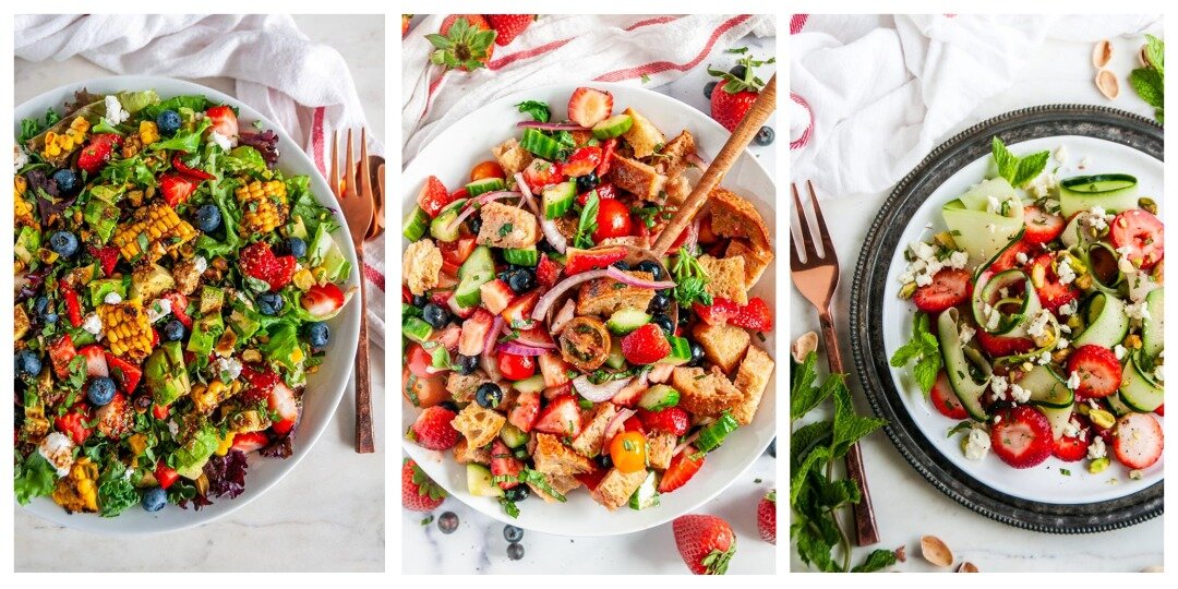 В сезон клубники вы просто обязаны попробовать эти салаты! Вкусные, полезные, простые в исполнении! Ягодно-помидорный салат Сочетание сладости и свежести клубники и черники, аромата базилика и хруста сухариков из хлеба делают этот салат незабываемым и вкусным блюдом на любой праздник. Ингредиенты Приготовление Клубничный салат со шпинатом и рукколой Сладкая клубники в сочетании с терпкими нотками рукколы и шпината создают оригинальный и освежающий вкус этого салата, который можно приготовить всего за несколько минут. Ингредиенты Приготовление Клубнично-огуречный салат с фисташками Этот свежий и легкий салат с кисло-сладкой клубникой, свежим огурцом, фисташками и ароматным сыром с плесенью обязательно порадует любителей необычных сочетаний вкусов и текстур. Ингредиенты Приготовление В большой миске смешайте все ингредиенты вместе. Вот и все! Подается охлажденным. Салат из арбуза и клубники с огурцами Этот необычный салат сочетает в себе свежесть арбуза и огурцов, сладость клубники и