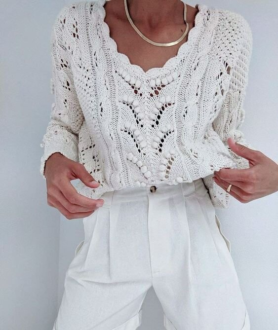 Вот схема основного узора в середине: Сетка всё еще на пике популярности: Источник и разъяснения к схемам тут: https://www.liveinternet.ru/users/gania/post499570554/ А это жакет вообще "пушка", мне очень понравился: Здесь источник и все схемки и разъяснения: https://www.liveinternet.ru/users/gania/post493388865/ А это спинка: А это платье хоть и не полностью белое,но мне очень понравилось: сетку можно взять любую,и цвет лицевой глади тоже) Я сама очень люблю белые модели в вязании, да марко, но как красиво, нарядно, ко всему подходит) А вы вяжете из белой пряжи?
