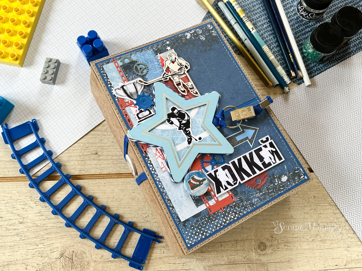 Привет-привет! С вами сегодня я, Оксана Салова , и пооотрясающая коллекция "Хоккей" ! Июнь, жара, не самое подходящее время для хоккея?) Готовим сани летом! А вернее - альбом для следующего хоккейного сезона! Для будущих побед! Потому что есть примета такая - если будет альбом, значит и обалденные фотографии спортивного триумфа тоже появятся!) Так вот, альбом. Внимание на обложку!) Размер альбома 15х22 см. Обложка состоит из трёх частей. Её фасады полностью бумажные. Люблю делать такие обложки для лёгких детских альбомов - обтянула переплётный картон крафт-бумагой, приклеила подходящий лист из коллекции, нанесла декоративную строчку. Хотя - не такая уж она и декоративная - этой же строчкой я закрепляю корешок. Ну а дальше - любимый процесс декора!) И в коллекции "Хоккей" есть буквально всё для этого!Для украшения обложки я использовала классный чипборд "Хоккей. Наш чемпион", умопомрачительные высечки (набор высечек "Хоккей. Основной состав"), добавила чудесную фишку (набор фишек "Хокк