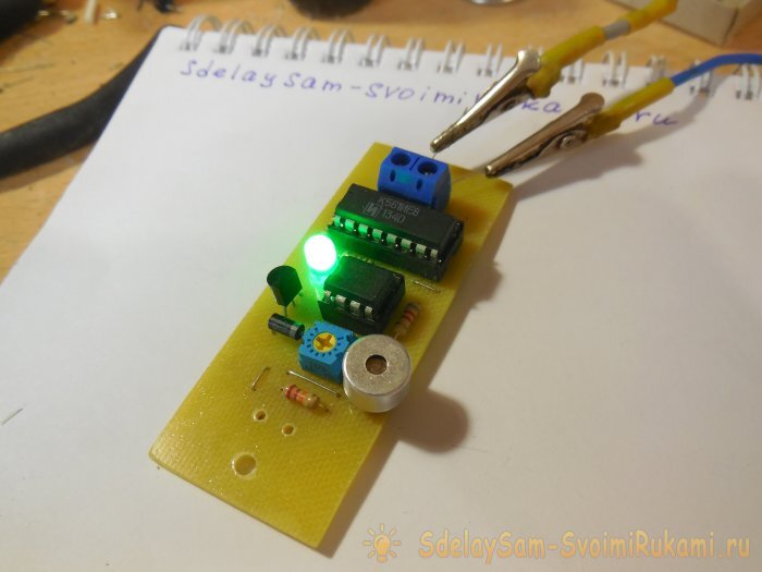 После тщательной проверки платы можно подавать на неё питание – постоянное напряжение 9-12 вольт. Если ничего не задымилось, а светодиод загорелся, значит всё собрано правильно. Теперь остаётся лишь покрутить подстроечный резистор, установив нужную чувствительность срабатывания. Не стоит делать выключатель слишком чувствительным, иначе он будет срабатывать от любого постороннего шума. Идеальный вариант, на мой взгляд, если срабатывания происходит при лёгком хлопке вблизи микрофона, тогда он не будет реагировать на посторонние шумы.
