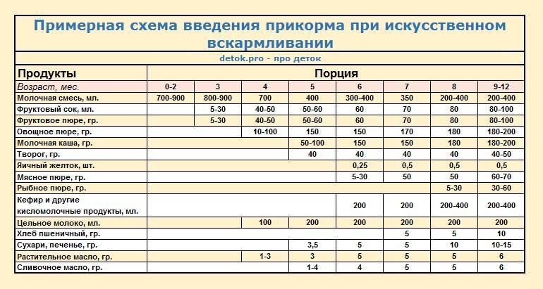 В обязательном порядке прикорм должен вводиться постепенно и объем порции увеличивается плавно. Это приводит к уменьшению количества прикладывания груди или более редким кормлениям из бутылочки. Во время составления меню важно следить за количеством белков, жиров и углеводов и помнить, что каждый ребенок индивидуален и количество еды, которое необходимо вашему конкретному ребёнку, можно определить только опытным путём.
