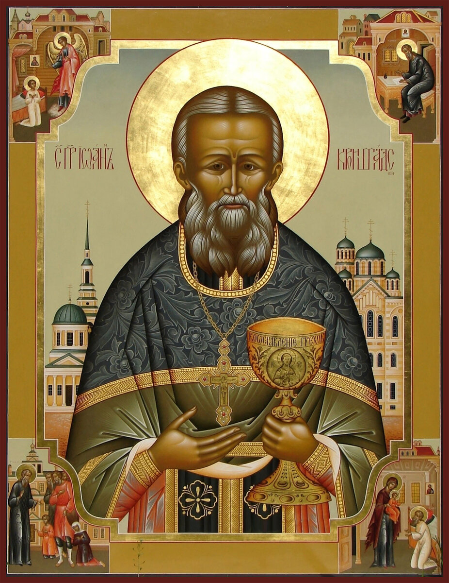 О, вели́кий уго́дниче Христо́в, святы́й пра́ведный о́тче Иоа́нне Кроншта́дтский, па́стырю ди́вный, ско́рый помо́щниче и ми́лостивый предста́телю! Вознося́ славосло́вие Триеди́ному Бо́гу, ты моли́твенно взыва́л: Имя Тебе́ — Любо́вь: не отве́ргни меня́, заблужда́ющагося. Имя Тебе́ — Си́ла: укрепи́ меня́, изнемога́ющего и па́дающаго. Имя Тебе́ — Свет: просвяти́ ду́шу мою́, омраче́нную жите́йскими страстя́ми. Имя Тебе́ — Мир: умири́ мяту́щуюся ду́шу мою́. Ны́не благода́рная твоему́ предста́тельству всеросси́йская па́ства мо́лится тебе́: Христоимени́тый и пра́ведный уго́дниче Бо́жий! Любо́вию твое́ю озари́ нас, гре́шных и немощны́х, сподо́би нас принести́ досто́йные плоды́ покая́ния и не осужде́нно причаща́тися Христо́вых Та́ин. Си́лою твое́ю ве́ру в нас укрепи́, в моли́тве поддержи́, неду́ги и боле́зни исцели́, от напа́стей, враго́в, ви́димых и неви́димых, изба́ви. Све́том ли́ка твоего́ служи́телей и предстоя́телей Алтаря́ Христо́ва на святы́е по́двиги па́стырского де́лания подви́гни, младе́нцем воспита́ние да́руй, ю́ное наста́ви, ста́рость поддержи́, святы́ни хра́мов и святы́е оби́тели озари́! Умири́, чудотво́рче и прови́дче преизря́днейший, наро́ды страны́ на́шея, благода́тию и да́ром Свята́го Ду́ха изба́ви от междуусо́бныя бра́ни, расточе́нная собери́, прельще́нныя обрати́ и совокупи́ Святе́й Собо́рней и Апо́стольской Це́ркви. Ми́лостию твое́ю супру́жества в ми́ре и единомы́слии соблюди́, мона́шествующим в дела́х благи́х преуспея́ние и благослове́ние да́руй, малоду́шныя уте́ши, стра́ждущих от духо́в нечи́стых свободи́, в ну́ждах и обстоя́ниих су́щих поми́луй и нас на путь спасе́ния наста́ви. Во Христе́ живы́й, о́тче наш Иоа́нне, приведи́ нас к Невече́рнему Све́ту жи́зни ве́чныя, да сподо́бимся с тобо́ю ве́чнаго блаже́нства, хва́ляще и превознося́ще Бо́га во ве́ки веко́в. Ами́нь.