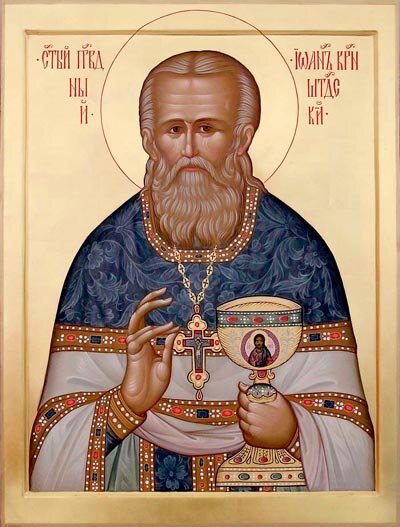 Восхва́лим, ве́рнии, ди́внаго па́стыря Кроншта́дтскаго, благода́ти тезоимени́таго,/ свети́льника, присногоря́щаго у Престо́ла Святы́я Тро́ицы,/ с Богоро́дицею и со все́ми святы́ми земли́ Росси́йския/ моля́щагося о спасе́нии всех, и́мя Госпо́дне призыва́ющих,/ да укрепи́тся в стране́ на́шей Правосла́вие/ си́лою Христа́ Пастыренача́льника, обетова́ние да́вшаго:/ Сози́жду Це́рковь мою́ и врата́ а́дова не одоле́ют ей.