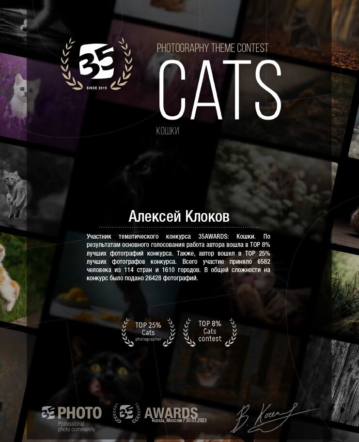 Принял участие в номинации "Кошки", попав в топ 19% лучших фотографий конкурса.