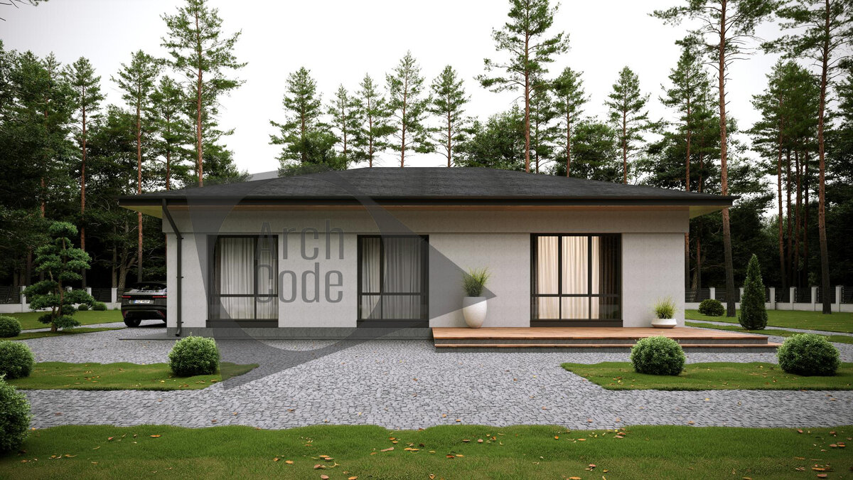 Представляем проект одноэтажного дома Площадь дома составляет 96.82 м2 Представляем вам проект загородного одноэтажного дома "Веванта-Финхаус" площадью 96,82 кв.м., который выполнен в европейском стиле и обеспечивает максимальный комфорт для жизни. Это компактный и уютный дом, который имеет очень комфортную планировку. Большие окна в пол, светлые фасады, выполненные фасадной штукатуркой в сочетании с декоративными деревянными панелями и гибкая черепица на крыше делают его богатым и привлекательным.