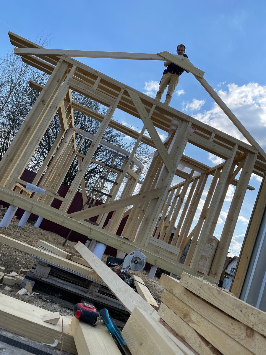 Всем снова хеллоу🙋♂️ По проекту собираем каркас далее, теперь на очереди стропила. Стропильная система как и каркас будет выполнена из доски 100х50. Свесы кровли в чистоте получатся 45см, такой размер получился исходя из угла кровли в 30 градусов и высоты будущего панорамного остекления! При проектировании каркаса я учитывал то, чтобы свес кровли доходил до верхней просматриваемой точки окна 👆, когда сидишь за столом, в противном же случае из-за слишком низких свесов часть окна была бы парализована🤷♂️ Сразу сделали обрешетку с шагом под металлочерепицу и лобовые доски по всему периметру. Если вам интересна данная тема, то обязательно подписывайтесь на канал, чтобы не пропустить её продолжение, задавайте свои вопросы в комментариях, если, конечно они у вас есть😉✅