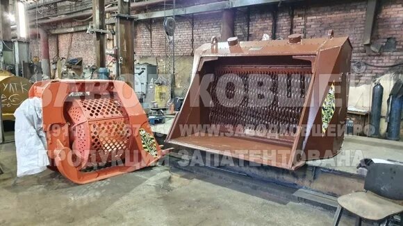 Если вы ищете просеивающий ковш для фронтального погрузчика, то обращайтесь на ЗАВОД КОВШЕЙ. Для данного вида техники наши специалисты изготавливают сменные устройства четырех типов. Это решётчатые (скелетные) ковши, эксцентриковые ковши (с неподвижной и вращающейся решёткой), ковши барабанного типа «Армата» и валковые дробильные ковши «ЧебуRUSSIA» (вращающиеся валы с «лепестками»). Первый тип сменных устройств отличается наиболее простой конструкцией, но такое изделие сортирует материал или грунт только за счёт действия силы тяжести. Поэтому решётчатые (скелетные) ковши применяют далеко не во всех случаях. Более эффективными являются сменные устройства с подвижным рабочим узлом. Вращающийся барабан создаёт центробежную силу, которая вместе с силой тяжести активно способствует перемешиванию материала или грунта, разрушению связей в нём и проталкиванию частиц в отверстия решёток барабана. Вращающаяся решётка приподнимает материал или грунт, после чего его (материала или грунта) отде