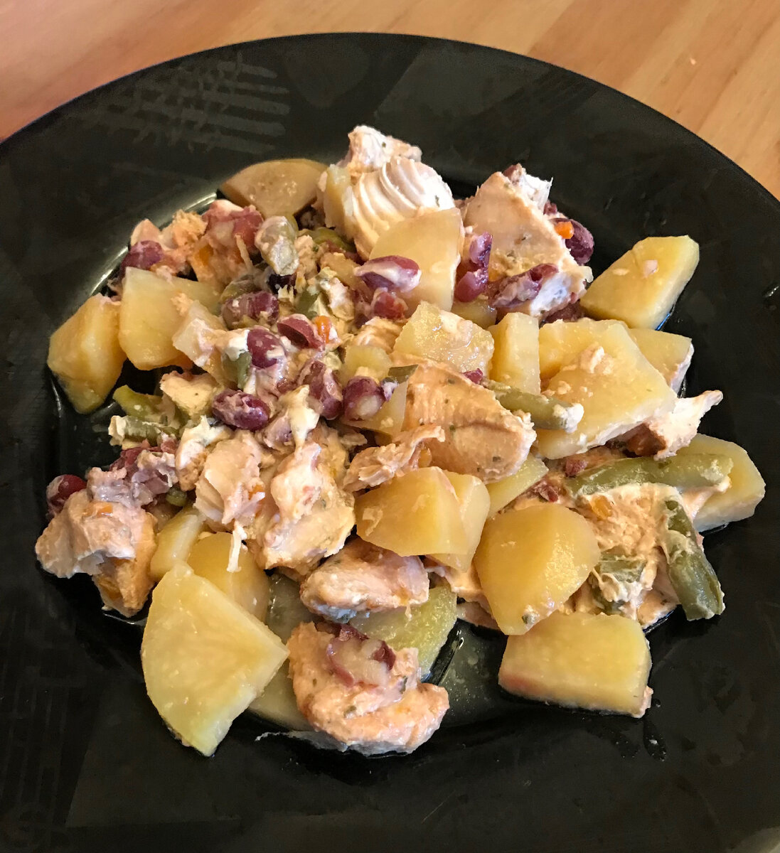 « Индейка с овощами» Тара: банка стеклянная 0,5 л Метод приготовления: автоклав, на пару Время приготовления: 50 мин Температурный режим: 120 градусов Инградиенты: филе индейки - 180 г, картофель - 100 г. фасоль - 20 г. Фасоль стручковая -20 г. соль - 2 г смесь сушенных овощей (Планета вкуса: морковь, лук репчатый, томат, лук порей, петрушка, укроп) - 2 г. бульон из кубика Maggi - 125 мл Способ приготовления: Фасоль замачиваем на 5-6 часов. Промываем филе индейки, нарезаем небольшими кусочками. Нарезаем кубиками 1,5-2 см картофель, вымачиваем от крахмала. Смешиваем все инградиенты с солью и приправами, раскладываем по банка по банкам, добавляем до плечиков бульон. Закладываем в автоклав. Время приготовления 50 мин. при температуре 120 градусов.