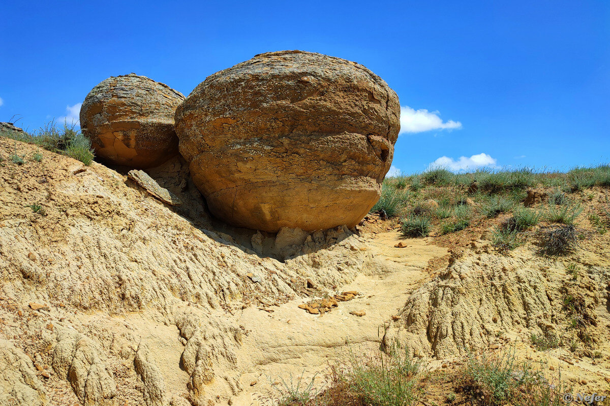 Одно из чудес природы. Происхождение этих шаров неясно до сих пор. Есть несколько предположений, окончательной версии нет. Удивительно, что шары имеют ядро. Таинственное место. Долина каменных шаров - это топ и абсолютное первое место среди всех достопримечательностей Западного Казахстана, которые мы увидели за четыре дня. Это регион Мангистау, примерно 150 километров от города Актау. Сначала асфальт, потом грунтовая дорога. Мы ехали на джипах. Сначала мы осмотрели более молодые шары. Похоже, будто они размножаются почкованием! Мистика какая-то, звучит нелепо. Но реально выглядит так. Можно наблюдать разные стадии: бугорки на шаре, местами детеныш проклюнулся, некоторые растут, как сиамские близнецы, пытаясь отделиться друг от друга. Подобные мысли пришли в голову не только мне, такая версия высказывалась. Однако, наиболее достоверными считаются другие. Ученые называют шары конкрециями, от латинского concretio - срастание, сгущение, сплочение. То есть шаровидные образования, в центре к