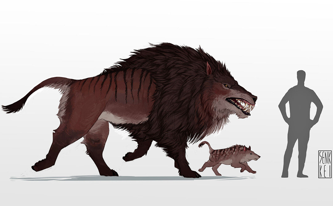 Привет, дорогие любители древней фауны. Сегодня у нас снова рубрика "самые-самые" и в ней – самый большой млекопитающий сухопутный хищник, когда-либо живший на нашей планете. Знакомьтесь – эндрюсарх, титан, который мог бы наводить ужас на наших предков, но малость не дожил до их появления. Примерно лет эдак сорок миллионов. Чтобы понять размеры этого монстра, достаточно взглянуть на рисунок ниже, где его череп сравнивается с черепами известных нам животных. между нижней и верхней проекцией титанического черепа скромно расположился череп гризли. Если вы поищите картинки этого зверя, то найдёте весьма противоречивые реконструкции. Это связано с тем, что вид описан по единственному найденному черепу, а потому достоверно можно лишь реконструировать только голову. Всё прочее – догадки палеонтологов, которые сопоставляют данный вид с его близкими родственниками, чьи скелеты сохранились полнее. В некоторых реконструкциях эндрюсарх представлен как волкоподобный хищник, с длинными лапами. Впроч