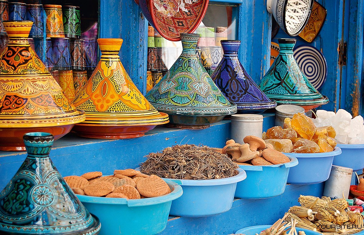 Керамика — яркие тарелки, тажины, вазы, пиалы и плитка с замысловатыми узорами и цветочными мотивами. Изготавливается вручную с использованием старинных технологий.