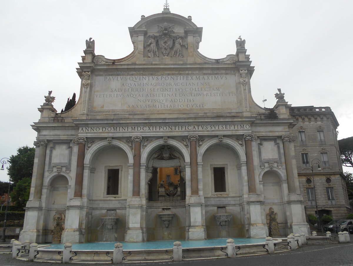 Джаниколо (Яникул) - восьмой и самый высокий холм Рима на правом берегу реки Тибр. На его вершине возвышается фонтан "Аква Паола" (Fontana dell'Acqua Paola), грандиозный и роскошный, римляне называют его Il Fontanone (Большой фонтан). Он открыт в 1612 году и снабжается водой из античного акведука Траяна, разрушенного в 6 веке и восстановленного в начале 17 века Папой Павлом V Боргезе. Фонтан построен архитекторами Фламинио Понца и Джованни Фонтана в ознаменование воссоздания акведука и назван в честь понтифика. Этот шедевр архитектуры из благородного белого мрамора выполнен в стиле барокко в виде монументальной триумфальной арки. Фонтан украшен гербом династии Боргезе, который держат два ангела, папской тиарой и ключами святого Петра. Проект фонтана был вдохновлен фонтаном "Аква Феличе" (или фонтаном Моисея) на Квиринале (ссылка в конце статьи). Возведен двадцатью годами ранее братом Джованни Фонтана, знаменитым архитектором Доменико Фонтана (любопытная деталь). Только здесь отсутст