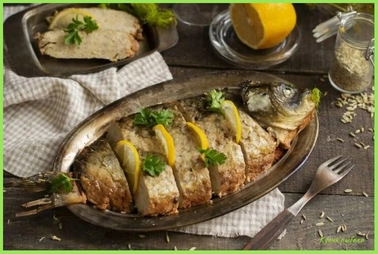 В зависимости от размера карпа немного отличается время приготовления, соответственно, чем больше рыба, тем дольше она готовится. Многие не любят карпов из-за мелких косточек, так вот, в этом рецепте такой проблемы вообще нет, начинка нежная и однородная, как хороший рыбный паштет. 📖 Ингредиенты: 1 потрошеный карп весом до 1 кг 120 г батона 2 луковицы 1 средний корень фенхеля 60 мл молока 25 г сливочного масла 1 яйцо 3 лавровых листа 1 чайная ложка смеси перцев 1 чайная ложка семян фенхеля соль, оливковое масло, вода 👨🍳 Приготовление: Для рецепта фаршированного карпа лучше приобрести потрошеную рыбу с головой, но если карп целый, то разрезаем брюхо, удаляем внутренности, тушку промываем. Отрезаем голову, она понадобится для сервировки и бульона, чистим карпа от чешуи. Это крупночешуйчатая рыба, поэтому процесс идёт быстро. Ножницами срезаем плавники, хвост оставляем. Острым ножом подрезаем кожу, затем аккуратно отделяем её пальцами от тушки, снимаем, стараясь не нарушить ц