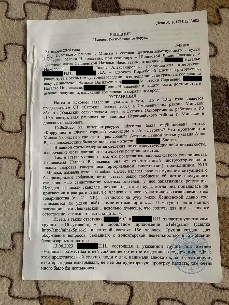 Приехали люди по устному договору и убрали собак. Люди с «Фауны», а не с какого-то там мифического приюта за Жодино, о котором пела «мадам соврамши». Без спросу взяли машину, втихую съездили в с/т Сутоки, отловили собак, положили деньги в карман. Левый рейс, левые деньги. Исчезновение животных, левые доходы без уплаты налогов, растрата денег из «общака» непонятно на что, враньё на голубом глазу от Лешневской и Вовы. Вот результат, которого все ждали.