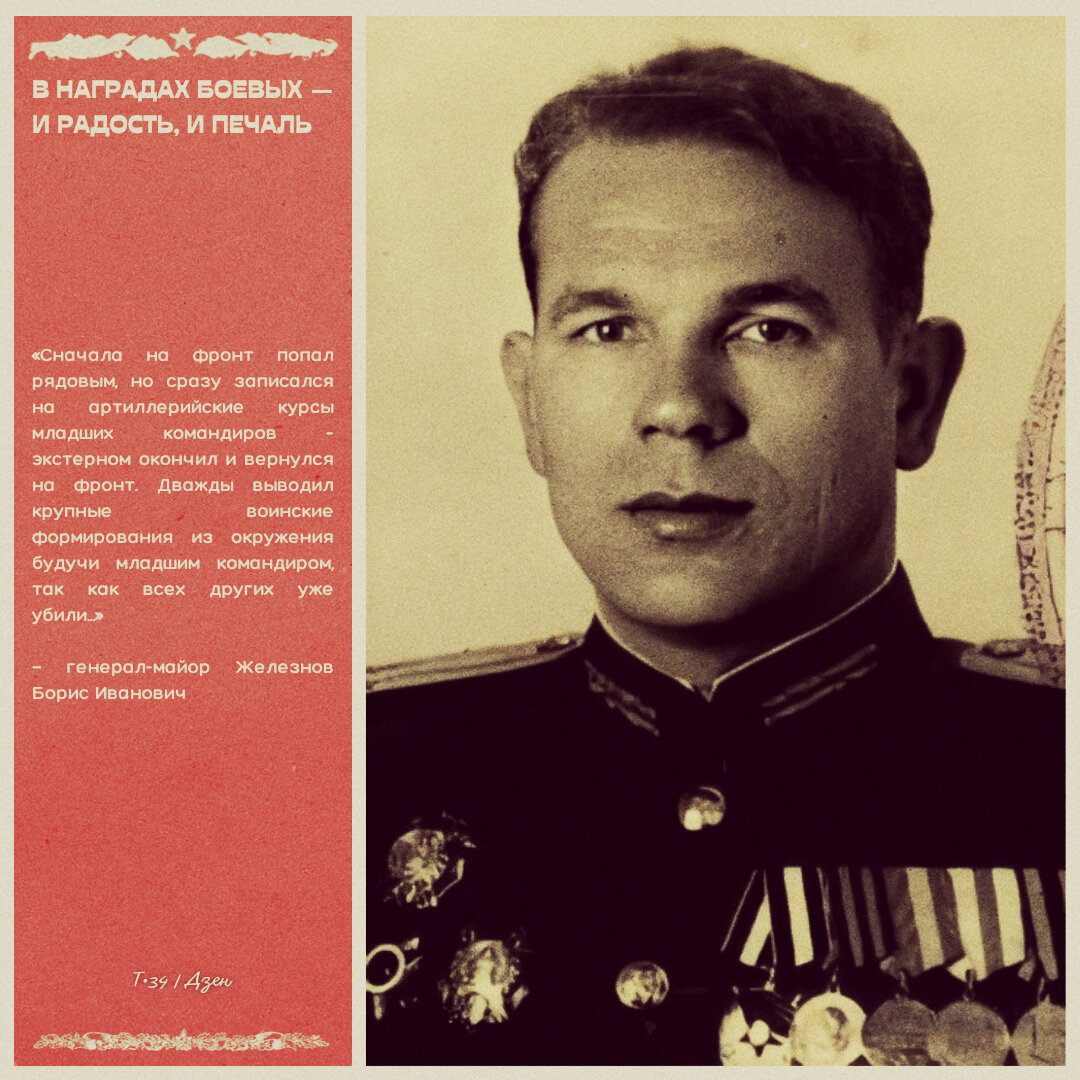 - Три эпизода. Не самых победных. Даже скорее критических. Но, по-моему, они показывают, как нужно самообладание человеку. Как неразделимы были в минувшей войне мужество и дарованная спортом физическая закалка. Только наш солдат — смелый и сильный — мог вынести на своих плечах четыре года смертельной войны. И победить! После войны окончил Военную академию имени М. В. Фрунзе и академию Генерального штаба имени К. Е. Ворошилова. И спорт всегда в эти годы был рядом со мной. Служить и не заниматься им невозможно. В спорте счастье и радость жизни узнаешь... Генерал-майор Б. ЖЕЛЕЗНОВ (1985)