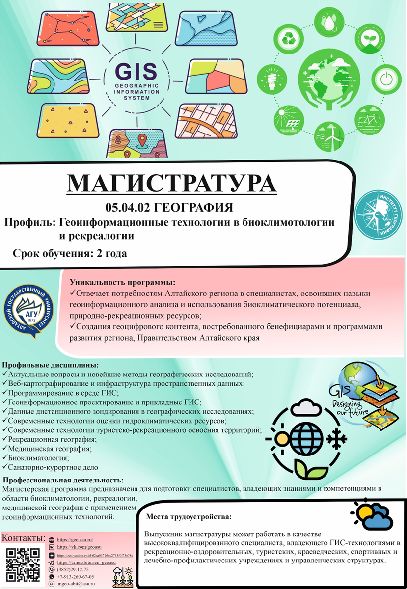 Кафедра физической географии и геоинформационных систем Научно-исследовательская работа кафедры сосредоточена в области изучения горных и равнинных ландшафтов, их эволюции в недавнем геологическом прошлом, современного состояния и охраны. Ведется подготовка специалистов в области геоинформационных систем. При кафедре имеются: кабинет эволюционной географии, учебная метеостанция и центр геоинформационных систем. Кафедра экономической географии и картографииНаучно-исследовательская работа кафедры сосредоточена в области экологического картографирования, экономической, социальной, политической географии России и мира, картографического метода исследований и других смежных дисциплинах. При кафедре имеется кабинет геоинформационного картографирования. Кафедра природопользования и геоэкологии
