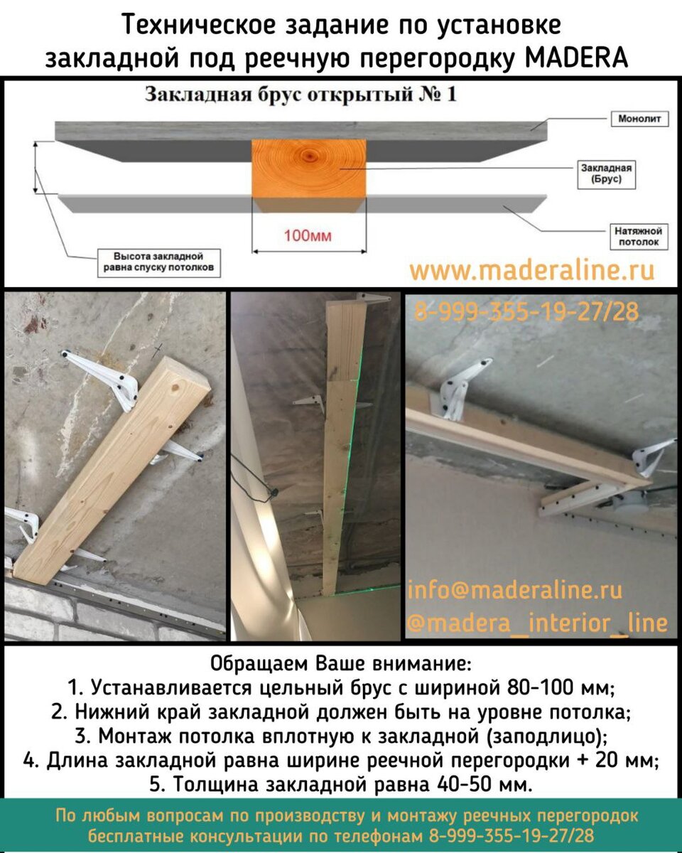 для установки реечной перегородки при натяжном потолке (или любой другой не жесткий потолок) Вам необходимо установить закладную. Ее ставят потолочники перед монтажем потолка. ТЗ по закладной для реечной перегородки ниже, сохраните себе, чтобы не потерять.