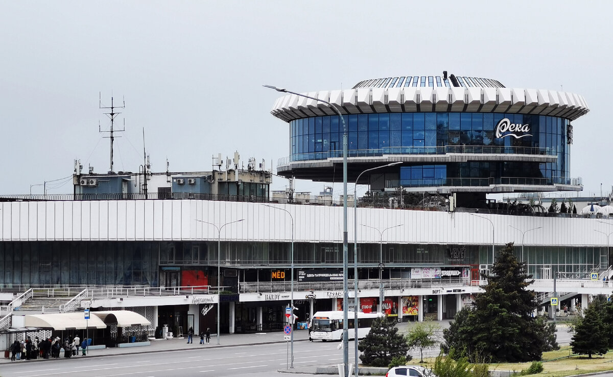 Ресторан расположился в здании речного вокзала, а точнее в самой его примечательной и заметной части – огромной застеклённой шайбе глубокого синего цвета. Кому интересно, рекомендую прочитать вот здесь небольшую статью и о самом речном вокзале, и об истории шайбы. и немного о самом ресторане. Много интересных фото, в том числе и самого ресторана.