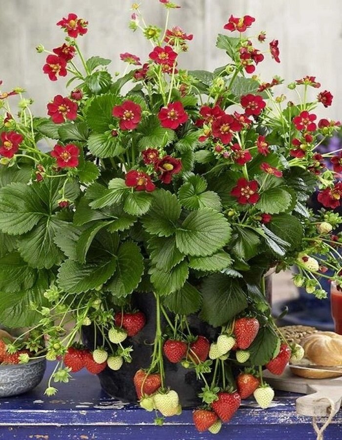 В качестве ампельной культуры смотрится очень эффектно. Каскады цветущих розеток на длинных побегах создают великолепный пейзаж. Но ещё интереснее выглядит земляника, цветущая малиновыми цветами. Чтобы узнать цену цветка нажми -> Узнать цену Срок созревания, потребления (срок хранения) Ремонтантный сорт, плодоносит с конца мая до заморозков. Плоды (ягоды) Размеры плодов ягоды до 35 г. Это красивые красные ягоды конической формы, которые при созревании распространяют необыкновенно приятный земляничный аромат. Мякоть приятной плотности, сочная, сладкая. Чтобы получить скидку нажми -> Получить скидку Дерево (куст) Кусты мощные: диаметром до 45 см, высотой около 20 см. Усы тоже мощные, могут отрастать на метр от маточного растения. Такая особенность в сочетании с ярко-рубиновыми или розовыми цветами идеально подходит для кашпо и вертикального озеленения сада. Возраст саженца 1 год Условия выращивания Лучше всего растет на легких и средних по механическому составу почвах с кислотностью рН 5