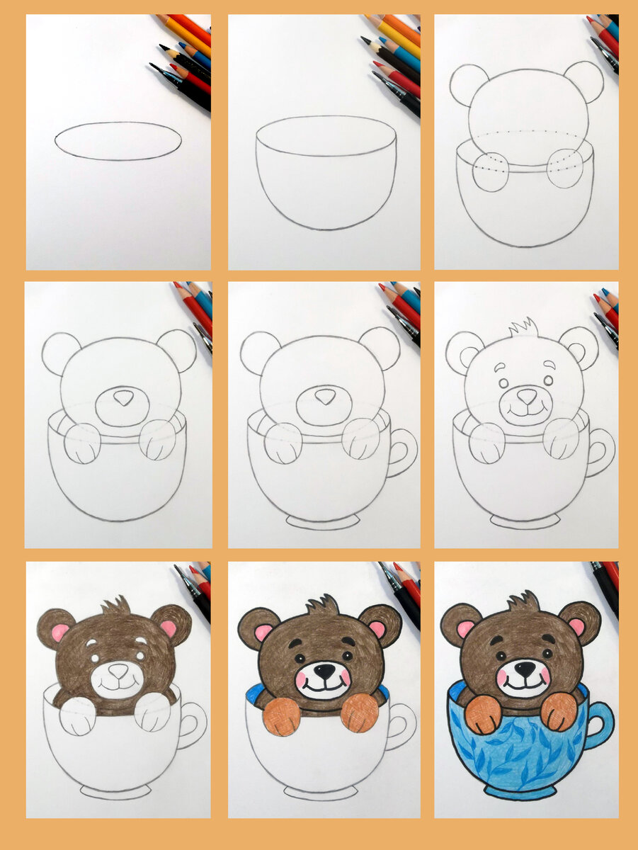ПОШАГОВО рисуем Милого Медвежонка в чашке Для рисунка тебе понадобятся: 1. Простой карандаш 2. Ластик 3. Цветные карандаши (лучше всего акварельные – они яркие и мягкие): темно-коричневый, светло-коричневый, розовый, синий, голубой цвета 4. Точилка 5. Черный линер или фломастер Сначала нарисуй простым карандашом вытянутый овальчик посередине листа – это будет горлышко у чашки. Затем к овалу добавь полукруг – это стенка кружки. Нарисуй широкий овал или круг над горлышком чашки – это голова мишки. На голове с двух сторон полукругом добавь ушки. Мишка держится лапками за горлышко чашки – их нарисуй двумя кружочками. Там, где показаны точки вместо линий – сотри ластиком. Теперь медвежонку круглую мордочку посередине головы и носик в форме маленького сердечка или кружочка. Добавь пальчики на лапках. Нарисуй кружке ручку и донышко. Дорисуй мишке мордочку: от носика влево и вправо улыбка. Над мордочкой круглые глазки и бровки. Глаза и брови можно нарисовать поближе друг к д