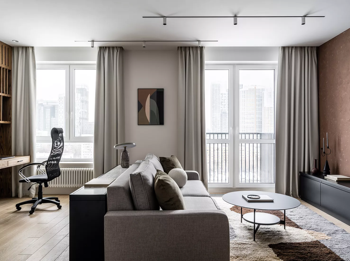 «Главной задачей для нас было обыграть основное достоинство квартиры — вдохновляющий вид на реку и город. Поэтому мы решили оформить интерьер в максимально нейтральных цветах, с минимумом деталей, интегрировав в пространство только все самое необходимое. Нам хотелось создать интерьер, отражающий образ амбициозного молодого человека, оформить пространство, которое бы тонизировало, придавало сил и энергии».