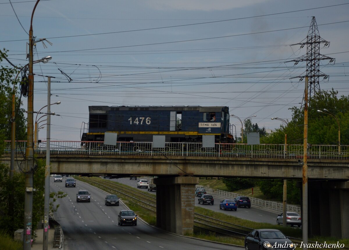 А на путепроводе, который проходит на стыке улиц Бебеля и Донбасской в сторону станции Садовая, последовал тепловоз ТГМ6А-1476 (принадлежит ПЖТ-55).